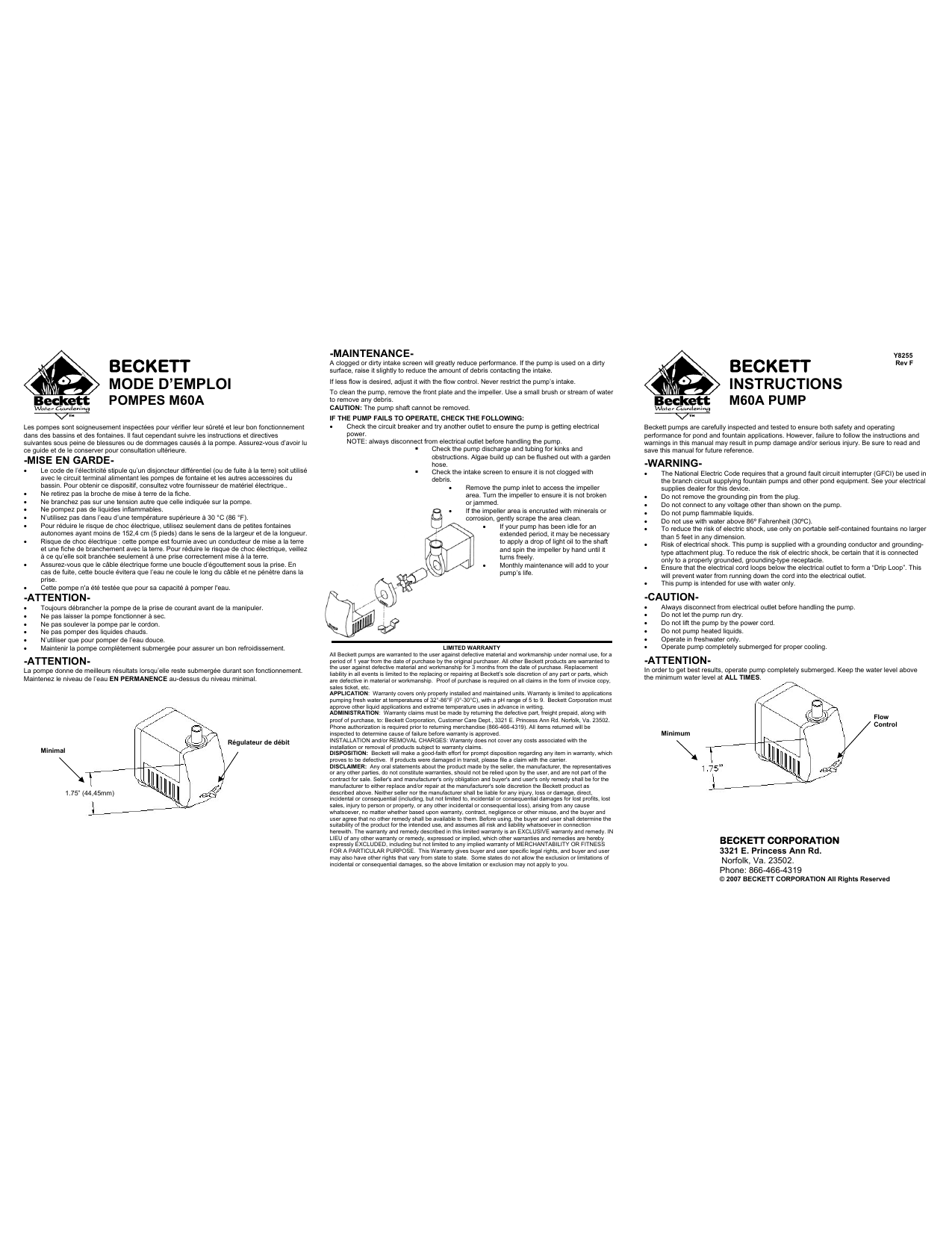 beckett corp m60a fountain pump manual